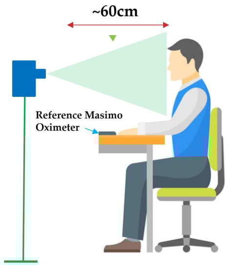 Figure 1). To provide a reference HR and RR reading, a contact-based finger pulse oximeter capable of recording both HR and RR with accuracy down to +/− 1 BPM (Mighty Sat Rx, Masimo, Irvine, CA, USA) is placed on one of the participant’s index fingers. All measurements are made under the illumination of fluorescent light (mounted on the ceiling, powered by AC electricity at 60 Hz), no special control of ambient light illumination is applied during the study.