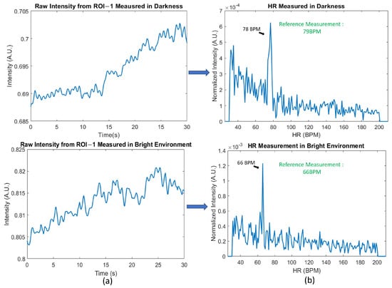 Figure 3 shows the (a) raw intensity from ROI-1 when measured under the dark/bright environment and the (b) corresponding frequency domain information. When measuring under the dark environment, all ambient lights are switched off and the background illumination is reduced to <1 Lux. When measuring under the bright environment, in addition to the ambient fluorescent lighting, an 100 W halogen lamp is placed 1 m from the participant to create an illumination of 960 Lux. In both cases, since our system relies on the built-in VCSEL laser for illumination, a clear HR signal can still be seen in the time domain and the correct HR rate is obtained using a Fourier transform.