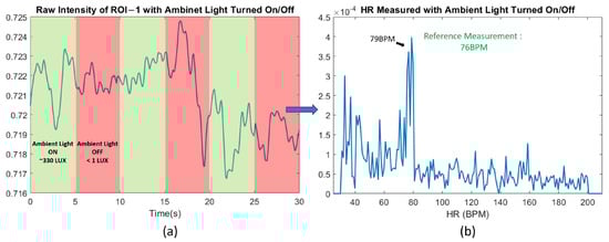 30]. To demonstrate the benefits of being independent of ambient lighting in physiological measurements, we show the results of HR measurement under various lighting conditions: a dark environment, a bright environment, and an environment where ambient light is switched on/off periodically.