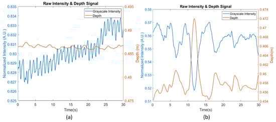 Figure 8 shows a 30 s segment of a typical 60 s recording of both the raw intensity and depth signal for ROI-1. The second row corresponds to the raw intensity information and the bottom row corresponds to the depth information from the same ROI-1. In ROI-1, the maximum motion from ROI-1 to the camera is as large as 15 cm. As a result, the raw intensity data is strongly inversely correlated to the depth information from the same ROI, suggesting that the raw signal is dominated by the motion artifacts. The grayscale intensity after motion compensation is shown on the top row of