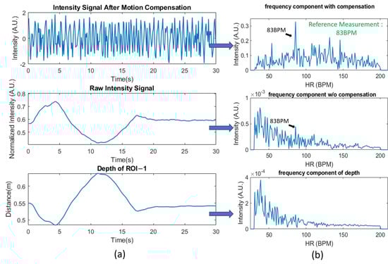 Figure 8 where most of the motion artifacts in the depth information are removed. From the time-domain signal, the heart rate signal becomes recognizable compared to the motion-dominated raw signal. The effect of the motion artifacts as well as the benefits of depth-based motion compensation is also evident in the frequency domain. When comparing the frequency domain signal of the raw intensity and the depth signal, we can see the two spectra are similar to each other in shape, and they also share many common lower frequency components. Even though a weak frequency peak near the reference HR of 83 BPM can be seen, it is overshadowed by the frequency component from the motion artifacts. After the motion compensation, we can see that in the frequency domain signal of the compensated signal (