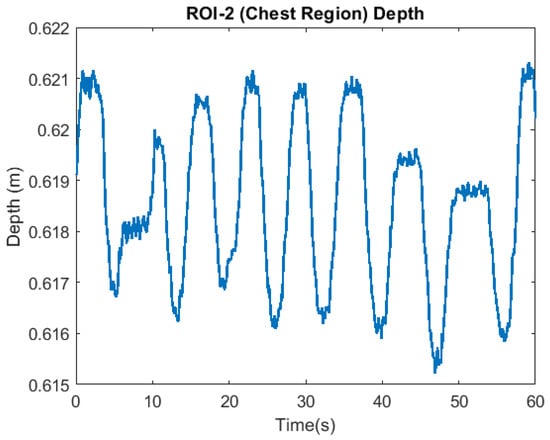 Figure 9 shows a typical depth signal from the ROI-2 (chest) region corresponding to a RR of 9 BPM. The amplitude of chest wall displacement caused by the respiration motion is approximately 4 mm. Because of this small amplitude, such motion could be affected by other factors such as overall body motion as well the blockage of clothing. Some potential solutions to mitigate these issues will be discussed in the discussion section.