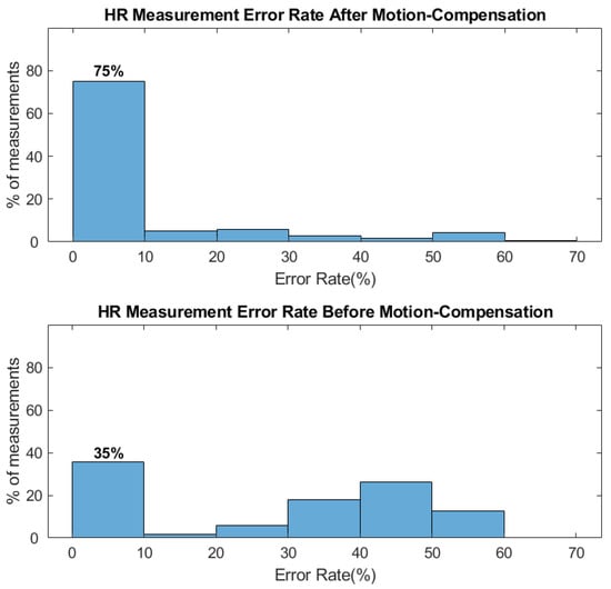 Figure 10 demonstrates the distribution of measurement error rate after compensation, while the bottom bar graph demonstrates the distribution of measurement error rate without depth compensation. With depth information used to compensate for motion artifacts, 75% of the HR measurements (214 out of 286 measurements) are correct. On the other hand, without compensation, only 35% of the HR measurements (100 out of 286 tests) are correct. It is also worth noticing that with motion compensation, many of the erroneous measurements are below 30% error rate, as compared to between 50 and 60% for the uncompensated case.