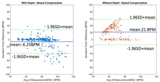 y-axis is the deviation of the HR measured in the ToF system from the reference oximeter reading. With compensation, the mean value of the deviation is −6.25 BPM, and 95% of the deviation falls within +/− 35 BPM of the mean deviation. In contrast, without compensation the mean value of the deviation is 21 BPM, and 95% of the deviation falls within +/− 36 BPM of the mean deviation. The large standard deviation rises from the extreme erroneous values of the measurement system. These extreme values rise from camera noises as well as intensity artifacts that are not reflected in the depth signal. After the dominating motion artifacts are removed, the system could wrongly pick up these artifacts as HR. This also explains why the wrong measurements of the uncompensated signal groups around the top left corner of the plot since the dominating motion artifacts are typically at a lower frequency compared to HR. Additionally, because the motion artifacts are likely to be mistakenly picked as HR, it also leads to the seemingly small standard deviation of errors for the uncompensated HR measurements.