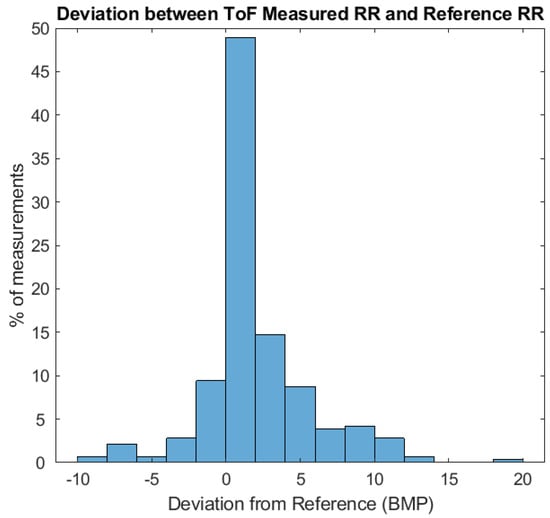 Figure 12 shows the percentage of 286 ToF-based RR measurements that fall into different bins of deviation from the reference Masimo pulse oximeter. The mean deviation from the reference reading is found to be 1.7 BPM while 60% of measurements are within +/− 2 BPM from the reference RR measurements. However, in our measurements, we can also sometimes see deviation as large as 10 BPM, these errors can be attributed to large body motion as well as the loose clothing that the participants are wearing. Some examples will be discussed in the discussion section.