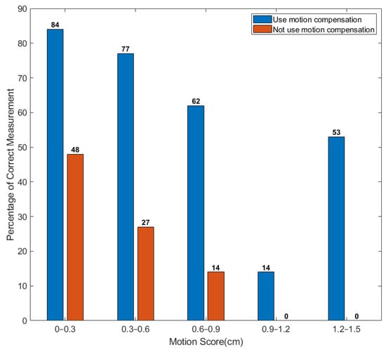To compare the performance between distance compensated and non-distance compensated HR measurements against different levels of motion, we plot the percentage of correct measurements versus a motion score (