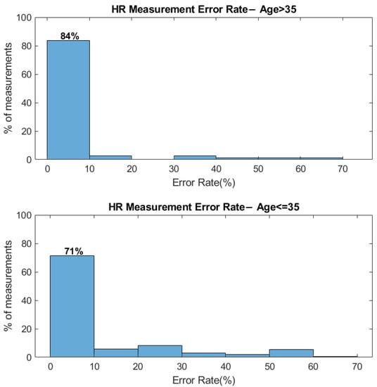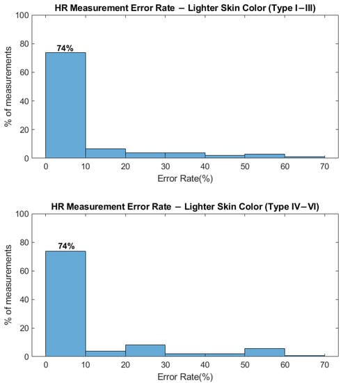 Figure 14 shows the error rate of the HR measurements among participants with darker skin color and lighter skin color. Participants with Fitzpatrick skin type I–III (17/29 participants) are considered as light skin color, while participants with skin type IV–VI (12/29 participants) are considered as darker skin color. Among the lighter skin color group, the percentage of success rate measurement is 74% with the mean deviation of the measurements being −6.1 BPM. As for the darker skin color group, the same success rate of 74% is achieved with the mean deviation from the reference at −5.8 BPM.
