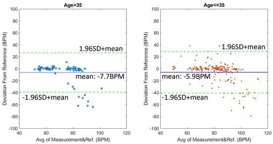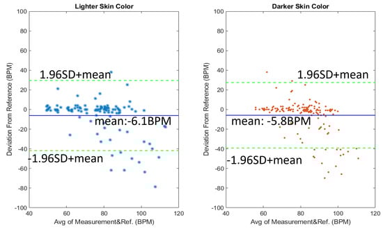 Figure 15. Both the mean deviation (−6.1 BPM for the lighter skin color versus −5.8 BPM for darker skin color) and the 95% percentile range (+/− 35 BPM for the lighter skin color versus +/− 33 BPM for darker skin color) are very similar between the two groups. Moreover, deviation distribution is also similar among the two groups, indicating that the ToF system used in this study performs equally well among participants of different skin colors. Thus, using near-infrared illumination, we are able to achieve performance independent of skin color.