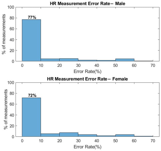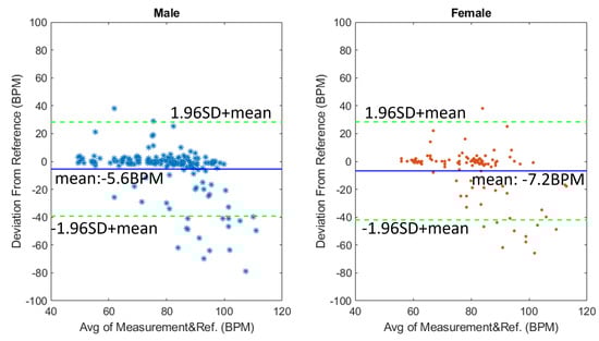 Figure 16 shows the success percentage rate among participants of different gender, we achieve a 77% success rate in the male group and a 72% success rate in the female group. The mean HR deviation from reference is −5.6 BPM for the male group (18/29 participants) and −7.2 BPM for the female group (11/29 participants) (