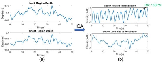 In this study, the RRs are acquired by directly measuring the displacement of the chest wall during respiration. In reality, it is often the case when the users’ bodies are involuntarily moving while the system is measuring the respiration rate. Therefore, similar to the HR measurement, the RR measurement could also suffer from motion-induced artifacts. Even though such an issue is less pronounced in this study as the participants are asked to sit in front of the camera, we still discuss possible methods to mitigate the effects of body motion that is unrelated to respiration. Since the neck region usually moves with the chest but does not show a strong respiration motion, we could use the depth signal on the neck as a reference region to separate the respiration motion from other body motions. Therefore, we could view the depth signal from the chest region as a superposition of the general body motion and the chest wall motion from respiration. A blind source separation method such as Independent Component Analysis (ICA) can then be applied to the raw depth signals to extract the respiration motion. For example,