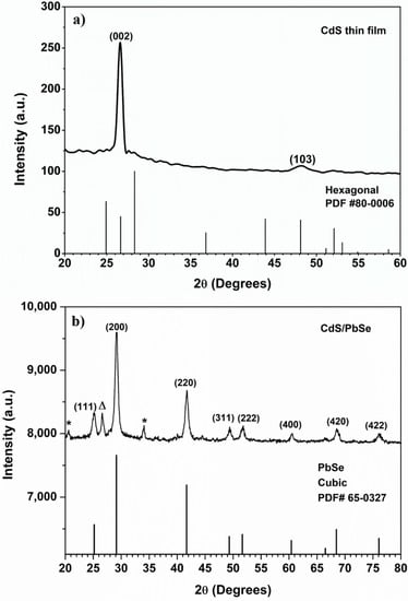 The XRD diffractograms of synthetized CdS and CdS/PbSe are presented in Figure 2. A hexagonal crystalline structure was observed in the CdS thin film (PDF# 80-0006, Cu X-ray source), with a preferential orientation crystalline plane (002) at 26.87° (Figure 2a). We also observed another diffraction peak at 48.24° corresponding to the same crystalline structure and the crystalline plane (103). No other diffraction peaks appear, indicating the absence of impurities during the deposition of CdS. Figure 2b shows the XRD of the heterojunction CdS/PbSe, obtained by converting plumbonacrite to PbSe by ionic exchange The XRD pattern match with the mineral phase of PbSe was called clausthalite (PDF# 65-0327, Cu X-ray source), which corresponded to a cubic crystalline structure with a preferential orientation crystalline plane (200) at 29°. As can be shown, only one diffraction peak of CdS was detected and denoted by , which corresponds to the crystalline plane (002) as aforementioned. Additionally, two extra diffraction peaks at 20.5 and 34°, labeled with *, appeared, which correspond to crystalline planes (−101) and (111) of the PbSe molybdenite monoclinic crystalline phase (PbSe + 4O3), according to the PDF# 15-0462 (Cu X-ray source). Therefore, the conversion from plumbonacrite to PbSe can be stated as successful, since no other diffraction peaks related to plumbonacrite appeared [26].