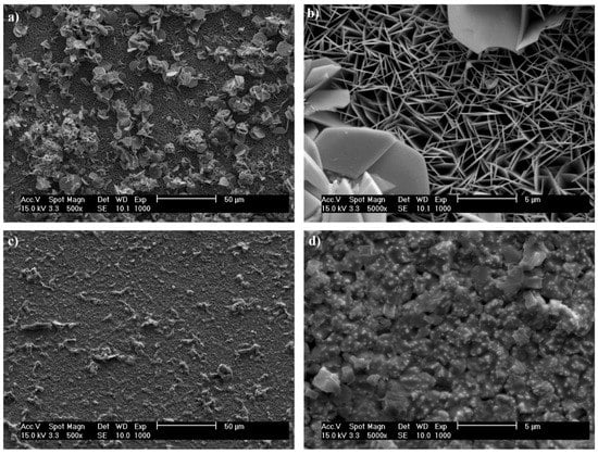 Figure 3 presents SEM micrographs of the surface morphology of the upper layer of the heterojunction before and after the ionic exchange with selenium. Figure 3a,b shows a flake-like morphology, corresponding to plumbonacrite film at 50 and 5 μm scale, respectively. Meanwhile, Figure 3c,d exhibits the change in morphology after transformation to PbSe, where the “flakes” of the precursor film disappear, showing a composite surface consisting of a flat background plus a roughness with different shapes. As can be observed in Figure 3d, there are cubic crystalline shapes with sizes around 1–2 μm, agreeing with the XRD results for PbSe.