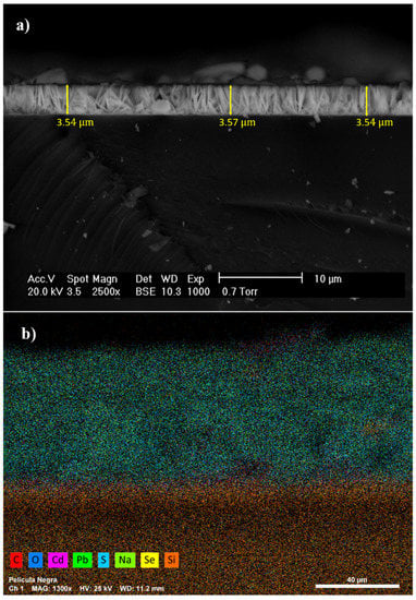 A cross-sectional view of CdS/Pb5(CO3)3O(OH)2 was used to estimate its thickness, which was found to be about 3.5 μm (Figure 4a). This value is similar to that obtained when plumbonacrite is deposited on corning glass substrates, as we have previously reported [26]. Figure 4b shows a perspective view of EDS elementary mapping of the CdS/PbSe heterojunction, with only a qualitative assessment of the present elements and their distributions. It evidences the presence of CdS thin film as the first layer of the heterojunction, followed by a second layer formed from PbSe in agreement with XRD results. On the other hand, the elemental mapping analysis of EDS exhibits a high concentration of sulfur in the upper layer, which does not correspond to the chemical composition of the PbSe film. Nonetheless, this result is due to the superposition of the Kα band of sulfur with the Mα band of lead, whose values are 2.309 and 2.342 keV, respectively.