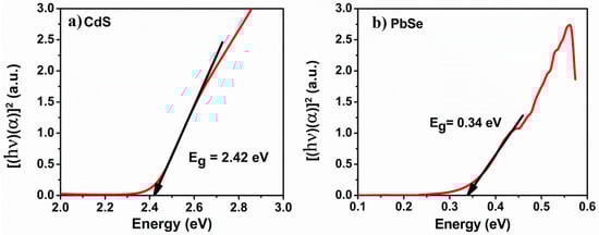 Energy direct bandgap calculated by Tauc procedure for each involved material of the heterojunction: (a) CdS; and (b) PbSe.