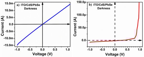 I vs. V characterization under darkness conditions for the ITO/CdS/PbSe heterostructure: (a) ohmic response (without annealing); and (b) diode response (annealing at 150 °C at 5 min).