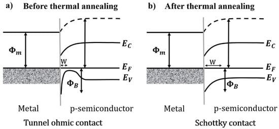 Furthermore, according to the literature, there are two types of contacts for a metal-semiconductor junction: ohmic and rectifier (Schottky) [34,35]. With this in mind, the similarity of the ITO/CdS/PbSe heterojunction with a Schottky diode suggests that the ohmic behavior initially obtained is due to the formation of a tunnel ohmic contact. Figure 8a shows the suggested energy band diagram for this type of contact, which forms a very narrow potential barrier at the interface, thus allowing the electrons to tunnel through the thin barrier [34]. While rectifying behavior was achieved by thermal annealing, this was attributed to better diffusion between the layers of the ITO/CdS/PbSe heterostructure, resulting in well-interlaced interfaces (Figure 8b).