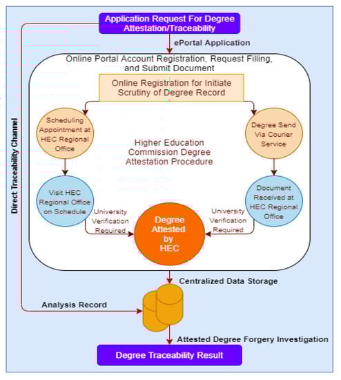 During a degree attestation and verification process, if an applicant wants to attest or verify his/her degree, they need to generate an online request through the HEC online portal. Once the request is generated, the applicant gets an appointment to submit the required list of documents online or through a designated courier service. In the next phase, the HEC starts the scrutiny process of degree verification and attestation and forwards the submitted documents to the appropriate degree issuing university or institute to verify the credentials [5,11]. Furthermore, this process also involves various other stakeholders and subordinated HEC regulatory bodies who regulate and verify the degree verification and attestation process between the applicant and HEC and HEC to universities. The current system used by HEC involves the following stakeholders, who are directly or indirectly involved in the degree attestation process.