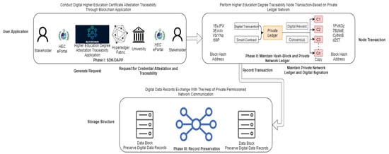 Figure 2 presents the blockchain distributed ledger architecture that enables hyperledger fabric smart contract technology to execute the smart contract and digital signature for degree attestation traceability. This block-based architecture is categorized into three main phases or levels; the one-to-one communication between the Higher Education commission and universities starts hiring bodies and state government officials to apply for scrutiny. However, the scrutiny process in the blockchain is quite different, as there is a digital verification of candidates’ degree credentials and tracing of the signature of the document attestation. Through phase 1, the application layer of blockchain architecture aims to conduct the attestation traceability procedure and provide HEC eportal distributed platform. In this regard, the blockchain-enabled distributed SDK application allows stakeholders to generate a request for degree attestation and traceability. Phase 2 maintains the overall transactions between the smart contracts and architectural validation, handles hash-based encrypted blocks, and keeps ledgers private in the network. Moreover, the transactional layer also manages the digital rewards between consensus and makes distributed copies of the transaction in the private network ledger in the smart contract. In phase 3, there is a digital degree record exchange within the chain because of peer-to-peer network connection, and data are preserved in the decentralized storage.