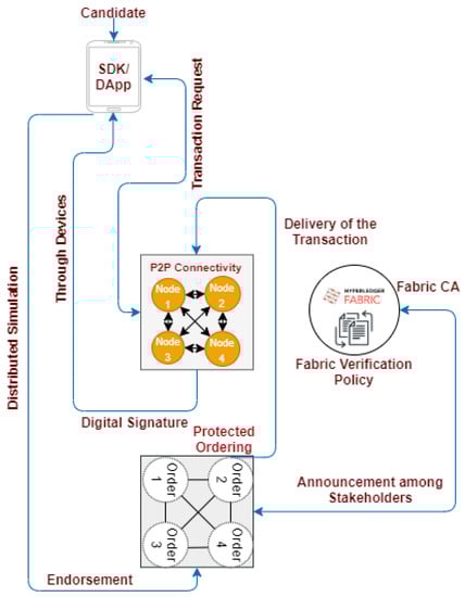 In this proposed HEDU-ledger, a hyperledger fabric enabled architecture is presented for the degree attestation traceability system that connects participating stakeholders from a peer-to-peer (P2P) private permissioned network, as shown in Figure 4.