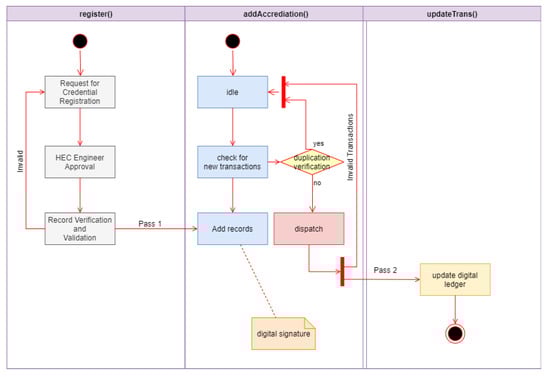 | Contact Initialization: HEC Engineer Initiate Transactions Data: The Distributed System Addresses Manages by HEC Engineer int main: x [file], Accreditation id (accredID), accreditation program; access (accredProgram), current semester enrolment; blockchain timestamp, [go]; transaction of degree record update contract (TDRUC add); Accreditation Manager (AM)/HEC Engineers, HEC AAC count (AACCount); Accreditation Manager is a set of all authorized addresses of the HEC state-based sub-engineers if int main.x [file] is Accreditation Manager (true) then if accumulation and accreditation program has not existed then; Accumulator and Accreditation Contract state is distinct or changed allow to add new records: accredID, accredProgram, current semester enrolment, int main.x, Add on TDRUC to the blockchain; AACCount + 1; else State and Rollback, end; else State and Rollback, end; |