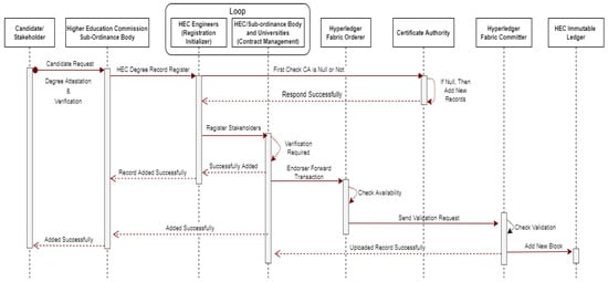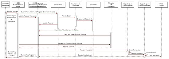 Figure 6 presents the identification and registration of degree attestation traceability sequence process in which HEC engineers maintain the main chain code of the system. The chain code is able to initialize procedures until the completion of transaction. Firstly, the proposal sends to the HEC regulatory authority, responsible for creating, executing, transferring, tracking, verifying, and validating transactions of the submitted proposal among the registered stakeholders. Then smart contract assists in acquainting, preparing, analyzing, uploading, transfer, and sharing degree credential registration details on the HEDU-ledger, as shown in Figure 6.