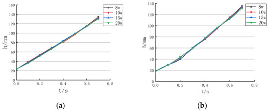 Figure 4a,b are the curves of the height of the top and bottom of the bubble rising with time. It can be seen from the curve that the number of grids in the four cases basically coincides with the curve, and there is no big difference. Therefore, the grid independence is verified. In this study, 150,000 grids are used for numerical simulation.