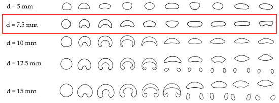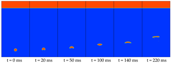 Before the numerical simulation, the correctness of choosing the VOF model for calculation is first verified in this article. In Figure 5, Wang et al. [25] studied the rising deformation of bubbles with different diameters. In our current project, the bubble diameters are all below 10 mm, the rising deformation of 7.5 mm bubbles is verified in Figure 6, so it is proved that this article chooses to use VOF for calculation.