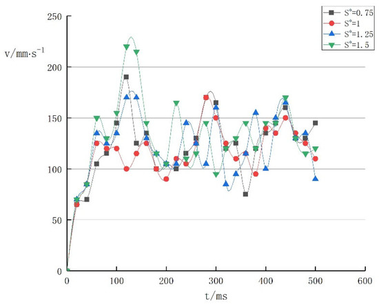 Figure 8 shows the average rising speed of the bubble every 20 ms in 500 ms. From Table 2, it can be seen that when the bubble rises, the speed will gradually increase, and when it reaches a certain value, it will gradually stabilize and fluctuate up and down within a certain range. The farther the bubble is from the wall, the faster the initial rising speed increases. From the two curves of and , it can be found that when the bubble rises in contact with the wall, the speed will be faster than the free rise of the bubble. It can be seen from Table 2 that the overall rising speed of the bubble within 500 ms can also prove that the bubble bounce motion will rise faster than the free motion.