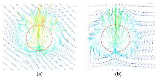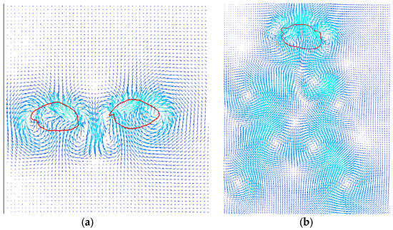 The velocity vector generated by the near-wall bubble and the central bubble rising 10 ms: (a) The central bubble, (b) The near-wall bubble.