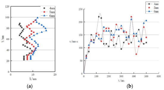 Bubble motion path and rising speed diagram under different diameters: (a) Motion path, (b) Ascent speed.