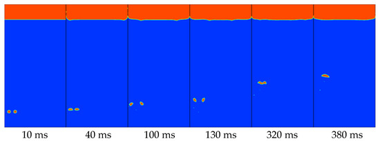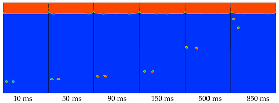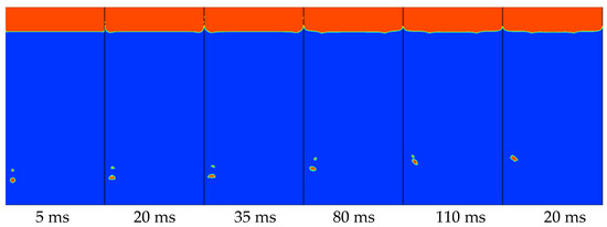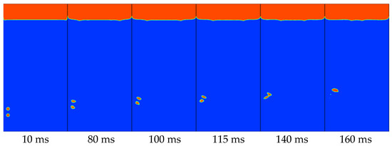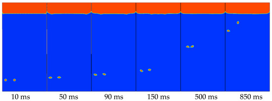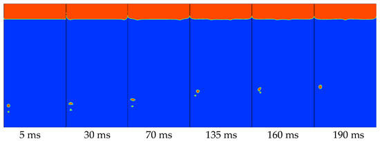 Figure 15 is a simulation of the rising motion of double bubbles of different sizes arranged vertically. The head bubble is large and the tail bubble is small. Contrary to the previous section, the bubbles still coalesce. It can be seen from the figure that it is different from the previous section. The big bubble first deflects at 70 ms, while the small bubble starts to deflect for the first time at 135 ms. The speed of the small bubble is faster than that of the big bubble. The two bubbles come into contact at 160 ms and then merge into one large bubble.