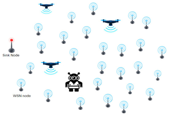 WSNs are a class of wireless networks that are becoming very popular with many civilian and military applications. Military applications initially provoked the progress of such a network. However, WSNs are now employed in many civilian applications such as wildlife and environment monitoring, industrial process monitoring, health care applications, roadway safety and traffic surveillance, smart homes and cities, and office automation. In most of these applications, a wireless network containing distributed independent sensor devices is used to collect state-describing data from a given field. This obtained data is then transmitted through the network to one or more sink nodes for processing, as shown in Figure 1. Figure 1 is the traditional view of WSN; however, in this paper, the traditional concept of WSNs is extended to cover mobile nodes such as robotics and Unmanned Aerial Vehicles (UAVs), as shown in Figure 2.
