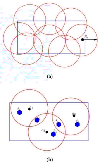 Area coverage focuses on actively monitoring the region of interest. Sensors that are placed randomly are shown in Figure 3a. Each circle depicts the sensing range of a sensor node. Conversely, point coverage concentrates on monitoring a region of interest. Target coverage is shown in Figure 3b. Three sensor nodes observe three targets, t1, t2, and t3, whereas all other targets, t4 and t5, are monitored by two sensor nodes. Additionally, target coverage saves energy and reduces the number of nodes required.