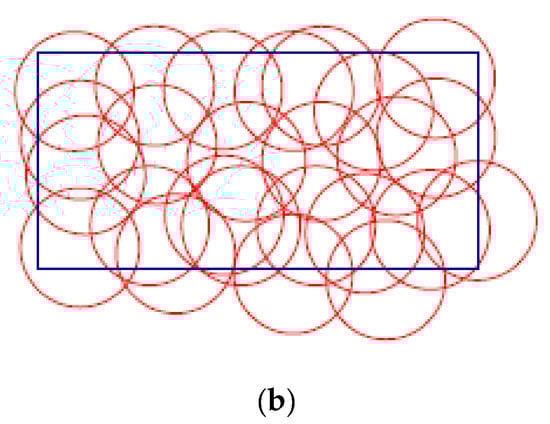 Deployment problems may be deterministic and random deployment. According to Figure 5a, deterministic deployment determines the nodes’ coordinates prior to their actual distribution. Sensor nodes’ positions are set to reduce network costs, energy consumption, high levels of target monitoring, and sensor network lifetimes. However, many applications disallow the adoption of a deterministic approach because of hostile environments or deployment costs. In these situations, random deployment is used. Randomly, Nodes are spread throughout the FoI, as illustrated in Figure 5b. Therefore, the WSN is expected to function better if sensor nodes are deterministically placed rather than randomly deployed [1,14].