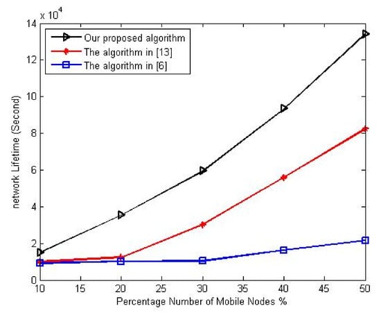 The first experiment studies the variation of network lifetime with a different number of mobile nodes. This experiment varies the percentage number of mobile nodes from 10% to 50% of the overall network nodes. The total number of sensor nodes in the network is set to 90. Figure 8 shows the variation of network lifetime to the percentage of the mobile node.