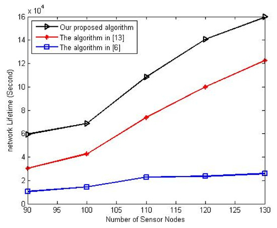 In the second experiment, the proposed algorithm’s performance is evaluated under different sensor nodes compared to the algorithms in [6,13]. This experiment varies the number of sensor nodes from 90 to 130 nodes while setting mobile nodes’ percentage at 30%. Figure 9 shows the variation of network lifetime with a different number of sensor nodes. From this figure, it can be observed that the proposed algorithm greatly increases the network lifetime in comparison to previous algorithms.
