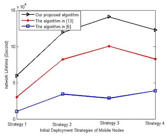 Influence of initial deployment strategy of mobile nodes on network lifetime.