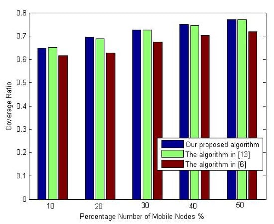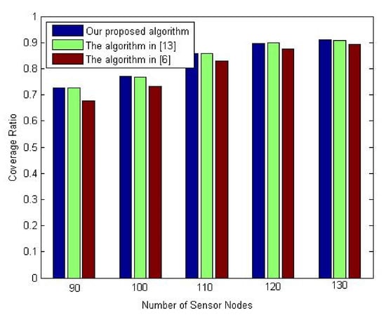 The second experiment of this set is conducted to evaluate the proposed algorithm’s performance regarding the coverage ratio against the number of sensor nodes. The comparison again is made against the deployment algorithms in [6,13]. A different number of sensor nodes is utilized. Throughout this experiment, the number of sensor nodes is varied from 90 to 130 nodes. The percentage of the mobile nodes is set at 30%.