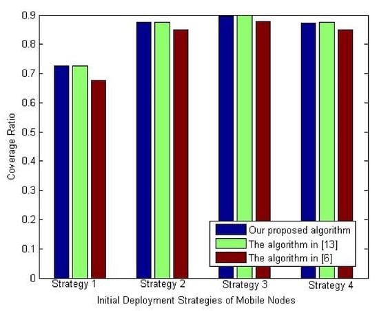 The third experiment of this set is performed to study the variation of the coverage ratio using mobile nodes’ initial deployment strategies listed in Table 5. This simulation experiment was conducted by fixing the mobile nodes’ percentage and the number of sensor nodes to 30% and 90 nodes.