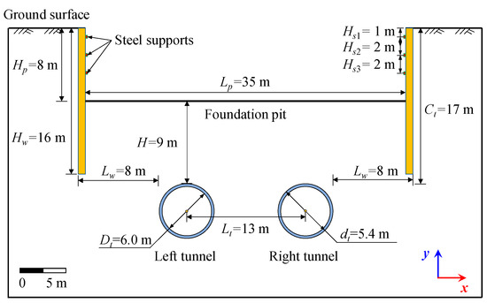 The case history of the foundation pit and the underneath shield tunnel in operation are essentially orthogonal to each other in plane, and their location relationship is displayed in Figure 1. The twin-tube tunnels are constructed by the shield-driven tunnelling method; the outer diameters (Dt) are 6.0 m and the inner diameters (dt) are 5.4 m. The tunnel linings are C50 precast concrete segments with a thickness of 0.3 m. The initial cover depth (Ct) of the tunnels before pit excavation is 17 m, and the clearance (Lt) between the twin tubes is 13.0 m. The foundation pit is about 35 m in length (Lp) and 20 m in width (Wp), with a final excavation depth (Hp) of 8 m. It is noted that the foundation pit’s side along the tunnel transversal direction is defined as the length (Lp), while the other side along the tunnel longitudinal direction is defined as the width (Wp). The clearance (H) between the crown of tunnels and the bottom of the foundation pit is 9 m. The foundation pit was supported by a diaphragm wall combined with transverse steel support. The final excavation depth (Hw) of the diaphragm wall is 16 m. The C25 concrete is utilized for diaphragm wall construction, with a thickness of 0.8 m. To reduce the deformation of the enclosure structure and enhance the reliability of the foundation pit, the support scheme of setting three-level steel supports along the excavation direction in the foundation pit was adopted. The depths of three-level struts are 1 m, 3 m and 5 m from ground surface.