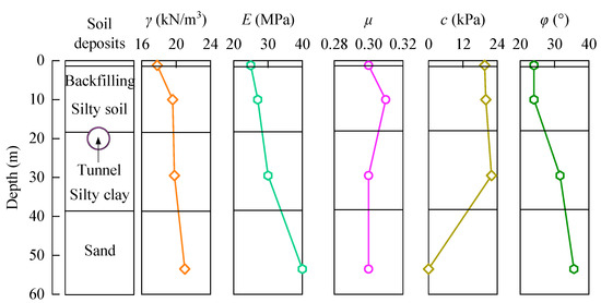 The worksite consists of four soil layers within 60 m depth [33], which are backfilling, silt, silty clay and sand, with thicknesses of 1.5 m, 17 m, 20 m and 30 m, respectively. The soil stratigraphic profile in the worksite is shown in Figure 2. It can be seen from the physical and mechanical parameters of the site that the soil weight (γ) was in the range of 17.8–21 kN/m3, the elastic modulus (E) was 25–40 MPa, Poisson’s ratio (μ) was 0.3–0.31, the cohesion (c) was 19.6–22 kPa, and the internal friction angle (φ) was 24–35.6°.