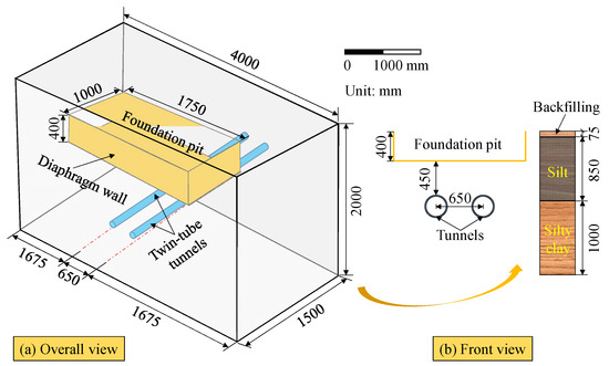 Of course, it is crucial to ensure the safety and availability of the existing tunnels, since excavation activities can change the initial ground stress state and lead to free soil movements [29,30]. Theoretically, the response of the existing tunnels caused by the excavation are the result of the interaction between the disturbed soil motion and the existing tunnel bearing capacity [31,32]. The construction of foundation pits in soft soils is often accompanied by extremely strong environmental effects, which will inevitably have an adverse effect on the existing tunnel, such as additional loads and bending moments. The literature review revealed that previous studies have focused on the impact of pit-underlying single-line tunnel with a single parameter. However, the impact of pit unloading construction on underground twin-tube tunnels, or the analysis of multiparameter impacts, have received little attention. This issue needs to be further understood. In view of this, an experimental test was carried out to study tunnel-soil interaction traits with reference to a pit unloading above the tunnel in soft soils. In-depth, three-dimensional numerical analysis was then performed to systematically investigate various factors on the response of the underlying twin-tube tunnels.