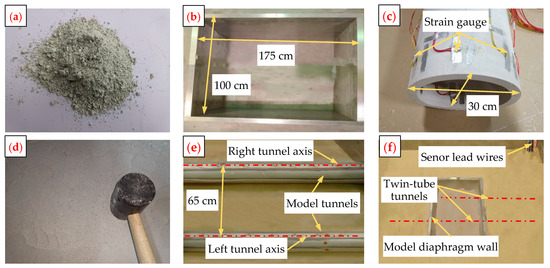 Some photos captured during the experiments, (a) mixed similar materials, (b) model diaphragm wall, (c) model tunnel with strain gauge ready, (d) material compaction (e), installation of twin-tube model tunnel, and (f) installation of model diaphragm wall.