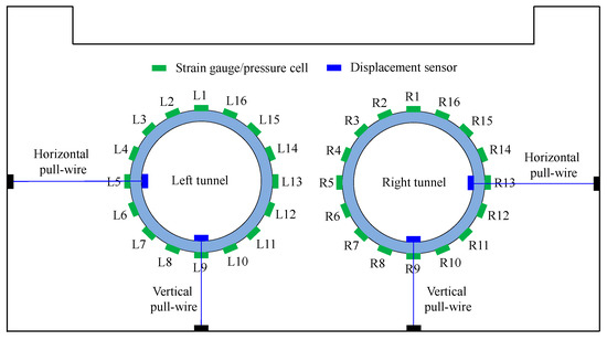 Given that the tunnel section directly below the foundation pit is most significantly affected by excavation, this section was chosen for the follow-up systematic analysis. The tunnel displacement is measured by pull-wire displacement sensors of a 0–100 mm measurement range with an accuracy of 0.01 mm, which meet the test accuracy requirements. The earth pressure is measured by YT-200G earth pressure cells. Strain gauges were utilized for monitoring the strains inside and outside the tunnel liners for the conversion of bending moments and axial forces. Figure 5 illustrates the sensors used for physical tests. The tunnel is arranged with 16 monitoring points along the transverse section with an equal counterclockwise interval. The points at left tunnel are named L1–L16 while the ones at left tunnel are named R1–R16, respectively. These 16 measurement points are arranged with earth pressure cells and strain gauges. The displacement sensors were arranged at the tunnel crown, invert and side wall. For example, measurement points L5 and R13 are used to measure the horizontal displacements of the tunnels, while L9 and R9 are utilized to measure the tunnel heaves. All earth pressure cells are applied to measure the radial earth pressure around the tunnel. The arrangement of pull-wire displacement sensors and earth pressure cells and strain gauges is shown in Figure 6.