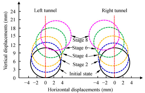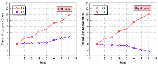 The measured displacements of the tunnels by the pull-wire displacement sensors in prototype scale are plotted in Figure 7, where positive values of vertical displacement indicate tunnel heave. It can be seen that the heaves of both tunnels experience the same tendency. With the increasing excavation depth of the foundation pit, the tunnel heave gradually increases, and then reaches the maximum when excavating to the bottom of the foundation pit. The measured heave at left tunnel is 9.88 mm while that at right tunnel is 10.22 mm. At the same time, an insignificant difference in tunnel heaves were observed during the first three excavation stages, but for the fourth excavation stage, the tunnel heave undergoes a more significant increase than in the previous three excavation stages. The horizontal displacements are relatively small throughout the excavation activities, with the maximum displacements of 2.52 mm and 2.47 mm at the left and right tunnel, respectively. Unlike tunnel heave, horizontal displacements in the tunnel are more sensitive to the changes in excavation depth. Although the effect of the first two excavation stages on the horizontal displacement of the tunnel is marginal, it undergoes a more pronounced shift in the third excavation stage (i.e., stage six). The deformation responses of the twin-tube tunnels at different stages are drawn and displayed in Figure 8. It reveals the fact that the latter two excavation stages produced an obvious increase in horizontal displacement, which account for 82.54% and 80.85% of the total horizontal displacement of the left and right tunnels. Moreover, both tunnels are observed to be significantly displaced toward the center of the foundation pit with excavation advancement.