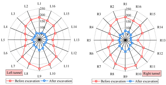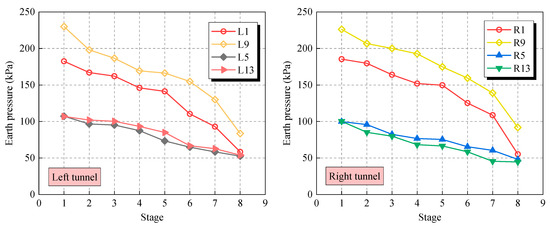 The measured earth pressure at points 1, 5, 9 and 13 are displayed in Figure 9, and the final distributions of earth pressure around tunnels before and after excavation are plotted in Figure 10. As can be seen from Figure 9, the vertical earth pressure at monitoring points L1, L9, R1 and R9 gradually decreased with the excavation of the foundation pit. When the excavation was completed, the vertical earth pressure was reduced to the minimum value of 58.27 kPa and 55.21 kPa at crowns, and of 83.47 kPa and 91.75 kPa at inverts of the left and right tunnels. The horizontal earth pressure at monitoring point 13 underwent the same trend as the vertical earth pressure at monitoring point 1 for different stages. Figure 10 displays the fact that, during the excavation and unloading of the foundation pit, the earth pressure around the tunnels is roughly gourd-shaped and symmetrically distributed. The measured earth pressure values at monitoring points 1, 5, 9 and 13 were utilized to derive the pressure ratios before and after the excavation of the foundation pit, which are summarized in Table 2. The reductions in the earth pressure at crowns of the left and right tunnels are 68.06% and 70.22%, while those at the inverts are 63.69% and 59.44%, respectively. Moreover, the reductions in earth pressure at the tunnel side walls are smaller than these at the crowns and inverts of the tunnels. This confirms a larger stress relief magnitude at the tunnels’ crowns and inverts than that at side walls. Additionally, the reduction in earth pressure at the tunnel side walls that are away from the foundation pit is slightly larger than the other side wall, near the foundation pit.
