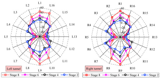 The bending moments measured at transverse sections of left and right tunnels after four excavation stages are plotted in Figure 11. The positive values of tunnel bending moments denote the outer side compressive moment and inner side tensile moment, while the negative values denote the opposite condition. It is demonstrated that the tunnel crowns and inverts are mainly under tension, while the side walls are mainly under compression. The tunnel bending moment increases with the increasing excavation depth of the foundation pit, and the variations are more pronounced at the crowns and inverts. The maximum positive bending moments of the left and right tunnels are 52.49 kN·m and 53.56 kN·m, respectively, and both of them are located at the tunnel inverts, i.e., the L9 and R9 regions. The maximum negative bending moments are recorded at the L5 and R13 regions of the left and right tunnels, and these two values are −51.31 kN·m and −46.76 kN·m, respectively. In addition, the increasing depth of the pit excavation leads to an increasing tunnel bending moment, at an increased rate. However, the increasing trend of the bending moments of the tunnel near the foundation pit side is slightly more pronounced than that far from the foundation pit. The last two excavation stages result in a more significant increase in the bending moments than the first two excavation stages, indicating that the disturbance effect on the tunnel increased as the excavation advances. Therefore, the excavation and corresponding unloading of the foundation pit cause significant disturbance to the tunnels, especially at the measurement points near the pit side, where the bending moment varies more dramatically.