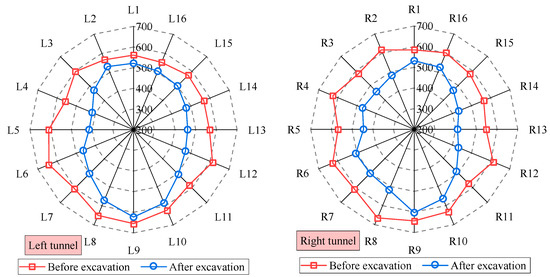 Figure 12 illustrates the axial forces at tunnel transverse sections before and after excavation. It can be seen that the excavation-induced unloading effect above the tunnels results in considerable variations of the tunnel axial force distribution. Before the excavation, the axial forces at the side walls of the tunnels are larger than these at the crowns and inverts. The axial forces at the upper part of the tunnels are slightly smaller than these at the lower part. The maximum axial force values for the left and right tunnels are 654.88 kN and 663.71 kN, which are recorded at measurement points L9 and R8, respectively, both of them were close to the inverts of the tunnels. After excavation, the axial forces at all tunnel parts are decreased to varying degrees. The variation in axial forces at side walls of the tunnels is significantly greater than that at the crowns and inverts. The locations of the maximum axial force are basically unchanged. As can been seen from Figure 10, the axial forces at or near the side walls of the tunnels are the most sensitive to the excavation unloading, with reductions of 194.72 kN and 181.72 kN at the L5 and R12 regions. The axial forces undergo excavation-induced decreases of about 31.96% and 29.65%, respectively, compared with before excavation. The variations of axial forces at crowns and inverts of tunnels are not significant. In this case, axial forces at the left tunnel crown and the invert are decreased by 7.05% and 4.84%, respectively, while these at right tunnel the crown and invert axial forces are decreased by 9.05% and 6.11%, respectively.