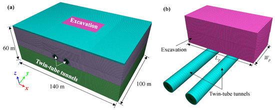 3D finite element mesh, (a) the whole mesh, (b) location relationship between foundation and twin-tube tunnels.