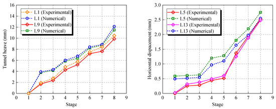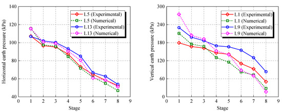 A comparison of the displacement and earth pressure of the left tunnel with the experimental tests for numerical validation is plotted in Figure 14 and Figure 15. It can be seen that the numerical results are larger than the model test results, but the two results are highly comparable in terms of variation trends, which can effectively provide assurance and support for in-depth parametric analysis on tunnel responses. Additionally, it confirms that the tunnel heave at the crown is larger than that at the invert. Meanwhile, the horizontal displacement at the near-pit side (L13) is slightly smaller than that at the away-from-pit side (L5).